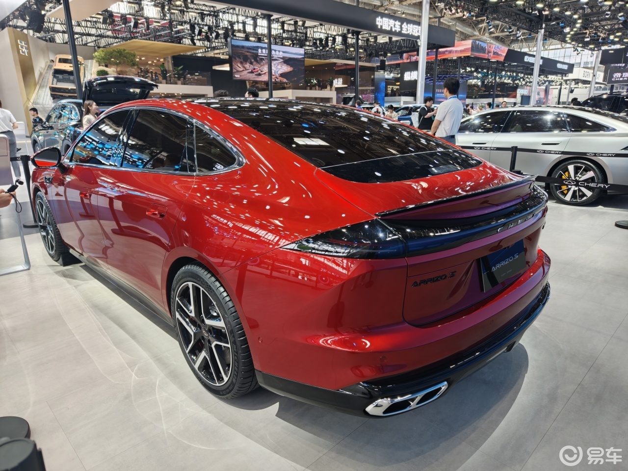 艾瑞泽S同样不是概念车,这款车可能是风云A9的燃油版本,尺寸是4998mm、轴距2920mm,之前有传言这款车会命名为艾瑞泽9。新车看上去真的和奥迪非常像,六边形的菱形格栅、锐利的大灯、两侧夸张的侧进气口设计,把奇瑞Logo换成四个圈完全不违和。火焰红的车漆很有高级质感,再加上大量的纤细镀铬饰条,还是很精致的产品。