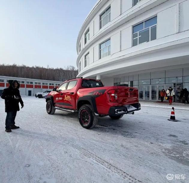车身侧面来看,新车采用了双排座车厢设计,在侧裙处拥有专属拉花,配合33英寸越野轮胎(17英寸轮圈)以及黑色轮眉,展现硬汉气质。尾部方面,该车货箱可以支持分段式打开,货箱上方并未配备龙门架,不过后包围处则可以看到拖车方口,具备合法上路的拖拽资质。