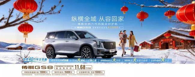 更让人心动的是,这个春节,传祺GS8把高性价比做到极致,重磅推出2月限时购车政策,让“12万买GS8”不再是奢望,轻松圆家庭大空间SUV梦。传祺加码置换补贴13000元、限时补贴15000元、再加上国家以旧换新置换补贴最高15000元,各项补贴叠加后仅需11.68万元起;更有5年或15万公里整车质保、终身免费基础流量、3年免费娱乐流量(6G/月)、5年免费道路救援服务,多重权益加持,2月完成购车开票即可享受,真正做到“低价入手,无忧用车”。