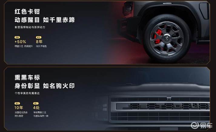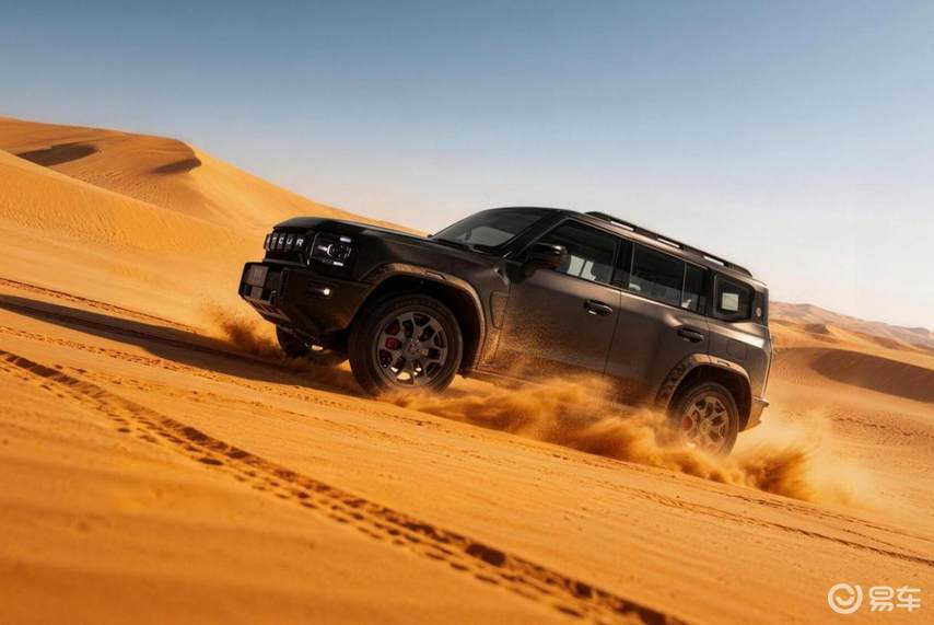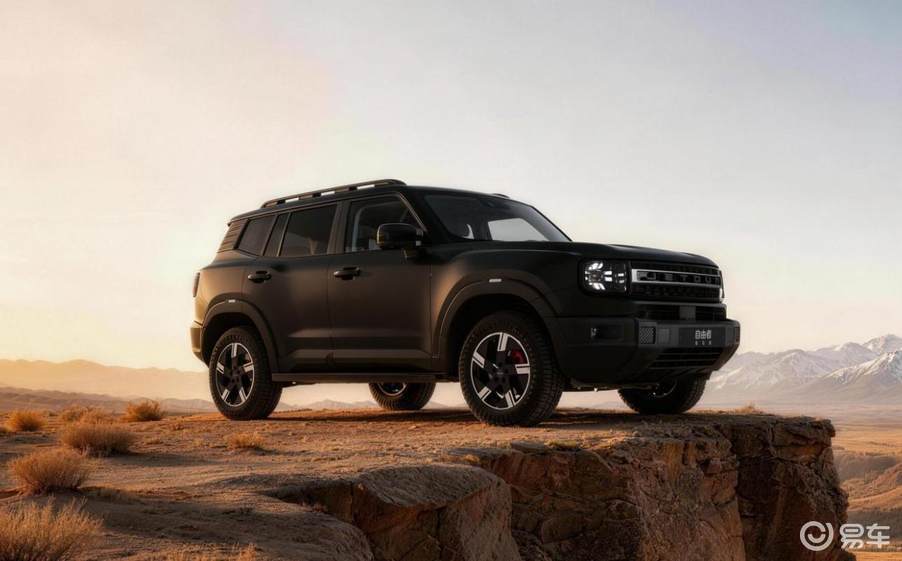 细节设计上,双车均配备黑化字标与外饰套件,将硬派质感贯彻到底,形成纯粹的整体雕塑感;轮毂内侧的红色卡钳堪称点睛之笔,不仅与哑光黑车身形成强烈视觉反差,更直观彰显其强悍的制动性能与驾驭底气。此外,双车延续“最美方盒子”的经典轮廓,平直的车顶线条、硬朗的车身棱角,搭配车尾外挂备胎设计,既保留了硬派越野的复古气质,又契合当下年轻用户的个性化审美需求。