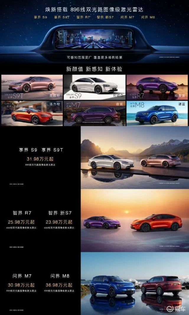 智界V9采用2+2+3式座椅布局,二排独立座椅支持旋转,可有45度迎宾模式、90度观景模式、180度对坐模式在内的多种模式。同时,二排零重力座椅还搭载有环抱式气囊,可一键调节靠背、腿托、脚踏。动力续航方面,智界V9搭载1.5T华为雪鸮智能增程系统,增程器最大功率 115千瓦。提供多种容量电池组可选,CLTC纯电续航里程分别为 210km、158km、223km,综合续航里程最高可达1250km以上。除开尚界Z7/Z7T、问界M6、智界V9三款重磅车型外,鸿蒙智行还对多款现有车型进行了焕新。