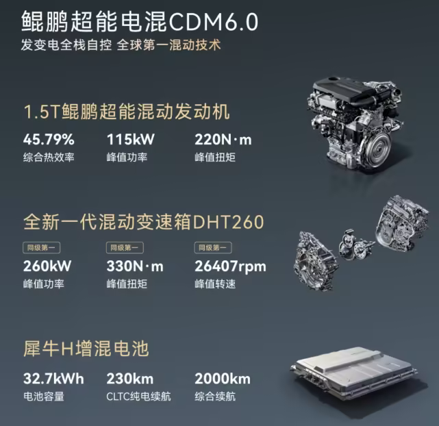 性能与节能方面,风云T9L搭载奇瑞最新一代鲲鹏超能电混CDM 6.0系统,1.5T混动专用发动机热效率达45.79%,系统综合功率550kW,零百加速迈入5秒级,馈电油耗低至3.9L/100km,综合续航突破2000km,彻底兼顾性能与经济性。同时配备飞鱼底盘、CDC电磁悬挂与雪豹智能四驱系统,6+1种全地形驾驶模式,适配各类路况,辅以磐石车身架构与全方位电池安全防护,筑牢全家出行安全防线。