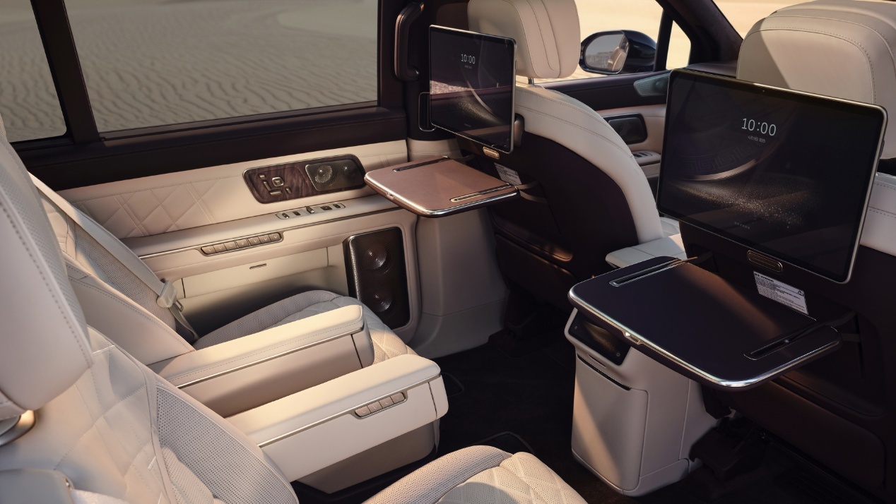 新车搭载采用前五连杆后H臂独立悬架结构,搭配六活塞制动卡钳,百公里最短制动距离仅35.3m;配备VMC车辆运动管理系统,最高涉水深度可以达到810mm;同时配备集成式液压全主动悬架和后轮转向系统,支持最大8.3°后轮转向,车辆最小转弯半径5.4m。