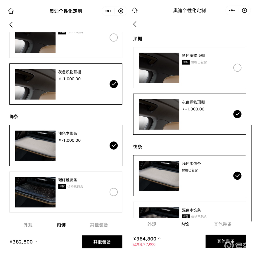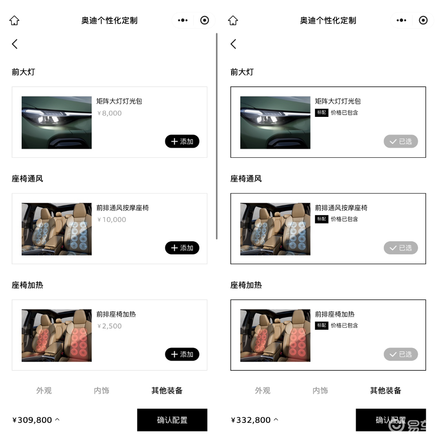 如果感兴趣的读者,可以在一汽-奥迪的官方小程序上面自己的选配一下,绑定逻辑比较复杂一点。