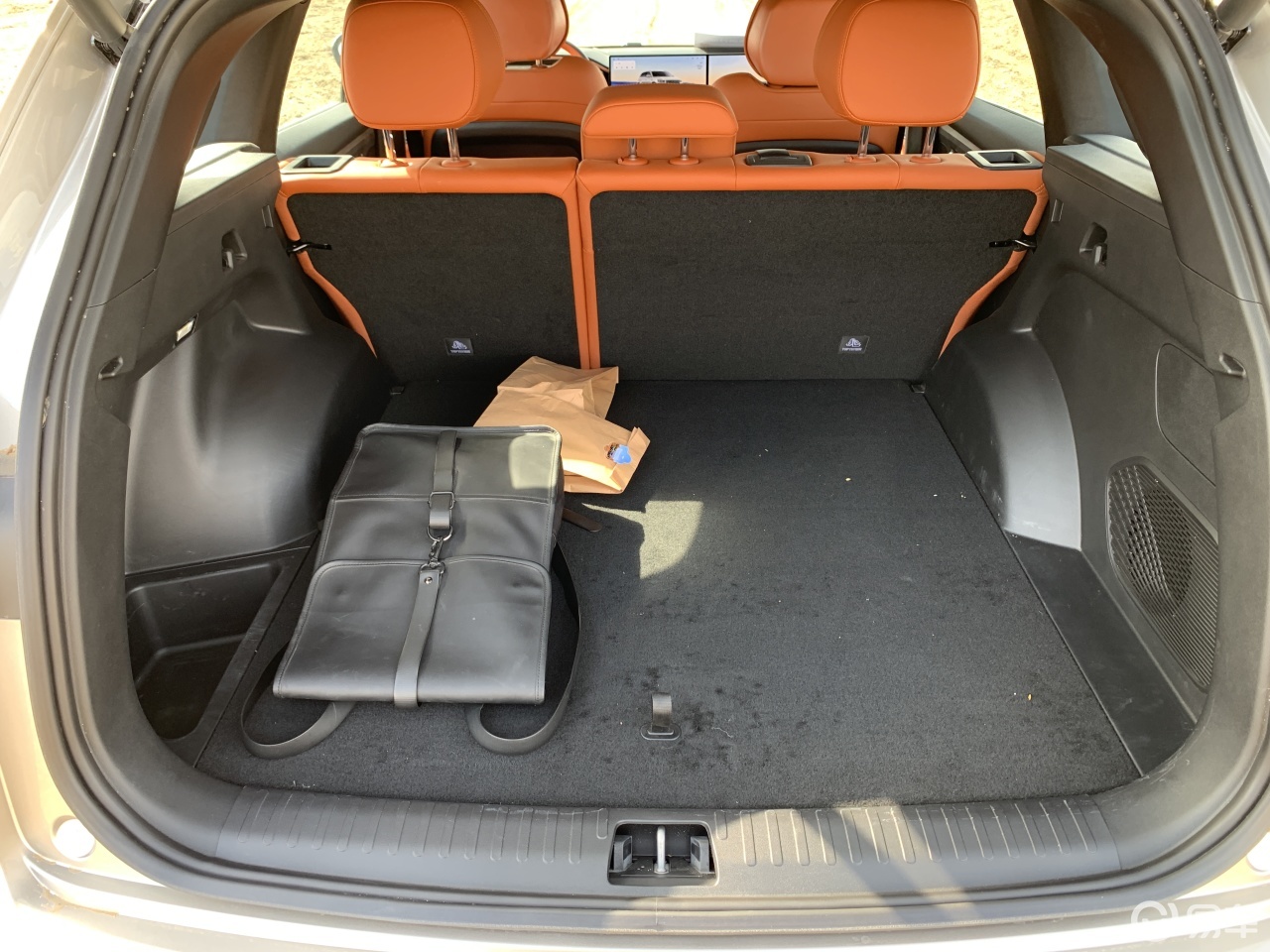 空间方面,延续了大五座的大空间,电池丝毫没有影响二排脚部和后备箱空间,后备箱地板下面还有个较大的储物槽。