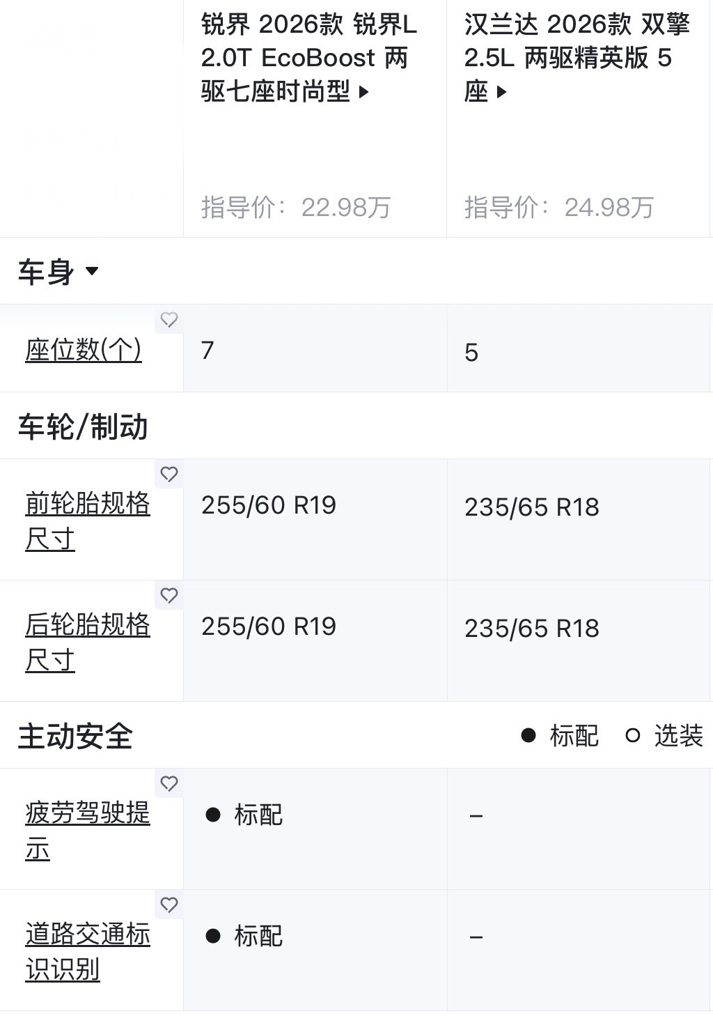 锐界L入门款时尚型,新增了智行驾驶辅助系统,这也就代表着26款锐界L全系车型都开始支持L2级驾驶辅助系统,汉兰达虽然也全系标配L2,但是像是疲劳驾驶提示、道路交通标志识别等进阶配置是没有的。而且锐界L可是全系标配7座模式,并且起步就是19寸的轮胎轮毂。汉兰达入门款依旧是5座模式,18寸的轮毂,所以说新款有进步,但仍有些遗憾。