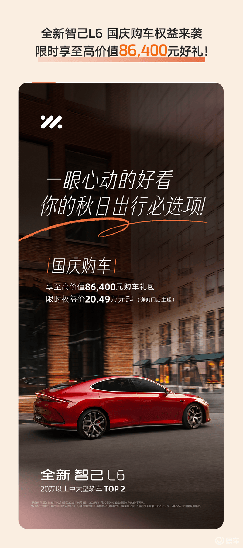 国庆长假期间购买全新智己L6,还可享至高价值86400元购车礼包。购买新一代智己LS6,限时0首付0息金融方案,至高价值1.6万元。