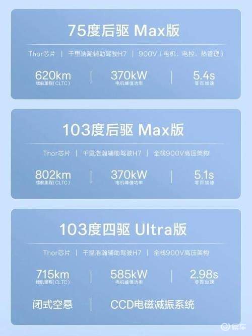 而对于追求性能与驾驶体验的消费者,103kWh四驱Ultra版无疑是首选。顶配版本拥有585kW的电机组和2.98秒的零百加速能力。这一版本还标配闭式空悬和CCD电磁减振,大幅提升了操控性和舒适性,无论是城市道路还是高速行驶,都能提供更为优质的驾乘体验。值得注意的是,Max车型是没有CCD电磁减振的,对于注重驾驶质感的消费者来说,这一点值得权衡。