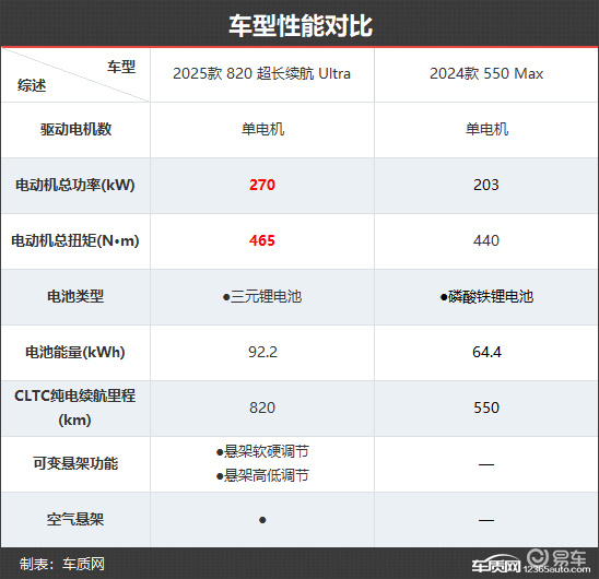 动力系统方面,新款车型基于全域800V高压SiC平台打造,提供单电机和双电机两种版本,其中,单电机版电动机总功率提升至270kW,电动机总扭矩达到465N·m。此外,电池类型更换为三元锂电池,能量达到了92.2kWh,CLTC纯电续航里程为820km,比老款车型增加了270km,彻底告别里程焦虑。值得一提的是,新款车型全系标配空气悬架,支持悬架软硬/高低调节,无论是车身姿态还是乘坐舒适性均得到较大的提升,值得点赞。