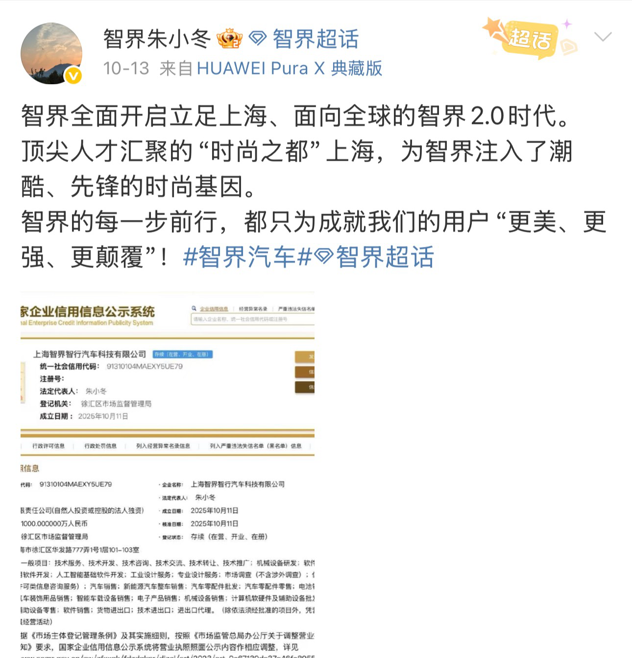 紧接着,几天前上海智界智行汽车科技公司在上海正式注册成立,由奇瑞汽车旗下的安徽智界新能源汽车有限公司全资持股,注册资本1000万元,实现产销服一体化独立运营,独立运营超过5000人规模,确保用户全拥车周期的体验,为品牌未来的发展扫清障碍。