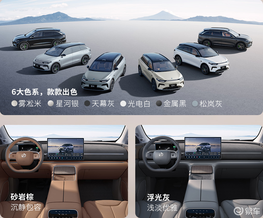 零跑C11的外观相对更圆润、居家一些,新上市后在原有光电白、金属黑、天幕灰、星河银、松岚灰基础上新增了雾凇米,所有颜色都可免费选装,而内饰的话则有砂岩棕、浮光灰两种新配色可免费选。