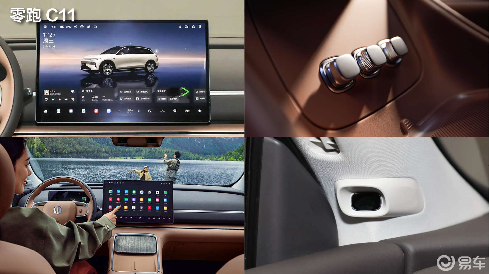 差异化主要体现在以下几个方面,比如其搭载的17.3英寸中控屏尺寸稍大,但不能左右旋转,Leapmotor OS 4.0 Plus操作系统同样支持分屏、自定义设置触发条件及执行动作,还可灵活自定义桌面智能卡片;前排座椅都不支持零重力状态;后面没有拓展屏支架;无法选装冷暖箱和负氧空调等。零跑C11比较独特的功能有目前可免费选装的3种香型+3档浓度的智能香氛系统、“零跑智投”可将switch和多种手机电脑设备投屏到中控屏、可配合座椅记忆/空调/后视镜记忆等功能且带疲劳监测的人脸识别系统。