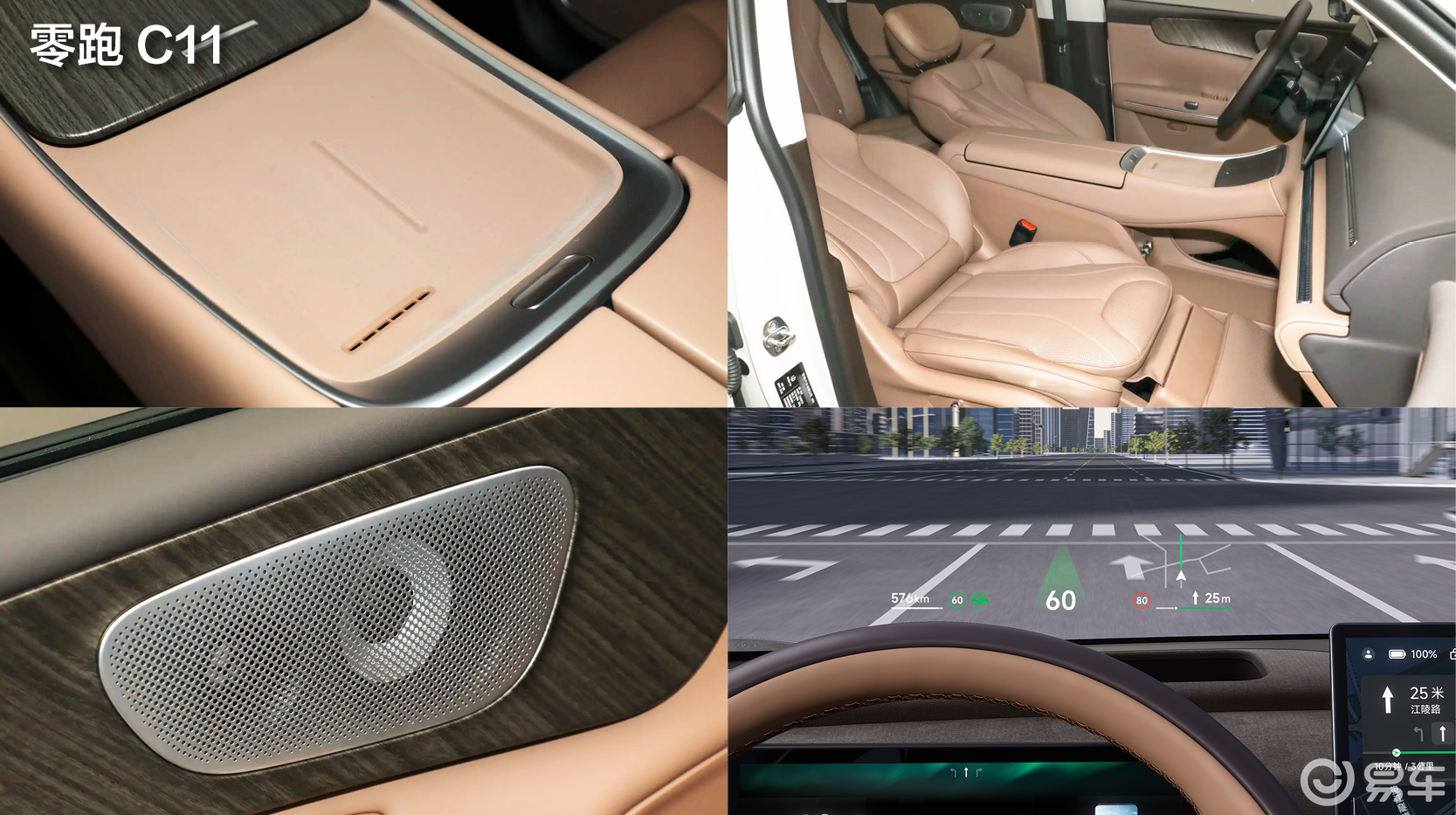 零跑C11在智能座舱的配置上与深蓝S07有很多相似的地方,比如全系标配高通骁龙8295P芯片、带风冷的50W手机无线快充、带通风/加热/8点按摩的主副驾座椅(带腰部推拿)、7.1.4声场布局的音响系统(21扬声器,总功率2160W,支持杜比全景声和无麦K歌)、等效60英寸AR-HUD、AI语音交互、带滚轮的方向盘等。