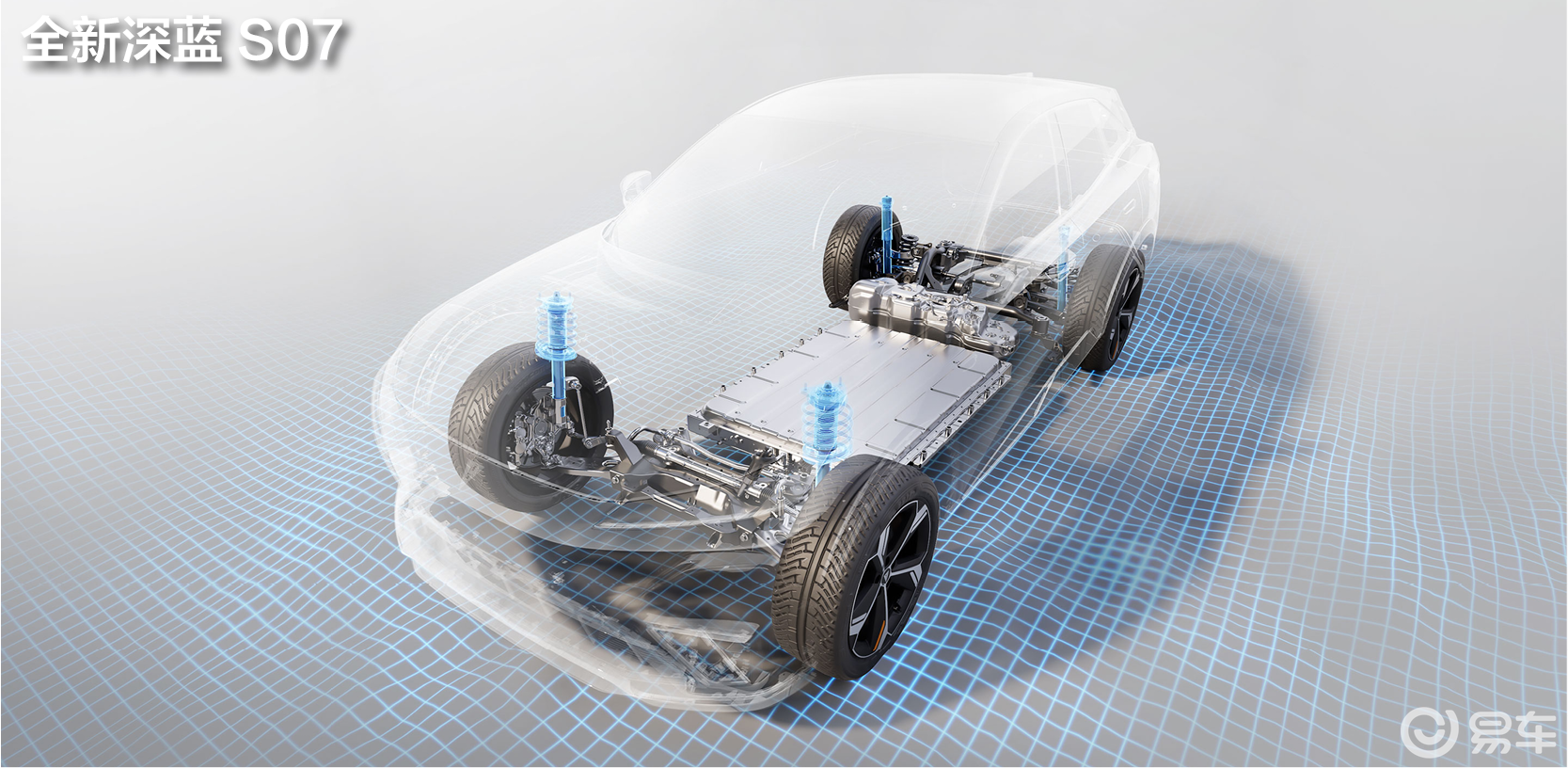 深蓝S07采用的是原力超级电驱2.0,单电机后置后驱的设计,最大功率200kW、峰值扭矩290N·m(峰值轮端扭矩3814N·m),百公里加速7.4s。其为了提高驾乘舒适性就全系标配有可变自适应底盘,主要由FSD可变阻尼减震器配合HRS液压式回弹止动器、前麦弗逊+后H臂多连杆悬架以及路感优化液压衬套等硬件组成,这样的配置以往在豪华车型上用的多,同级别车型中不常见,成本较高且比较考验调校水平。